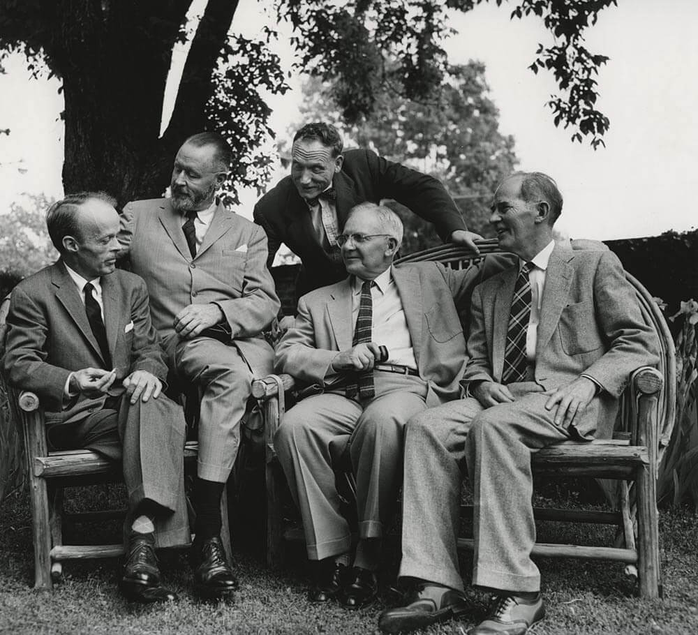 Photograph of the Fugitive Poets. From left to right: Allen Tate, Merrill Moore, Robert Penn Warren, John Crowe Ransom, and Donald Davidson, May 4, 1956. Vanderbilt University Special Collections and University Archives.