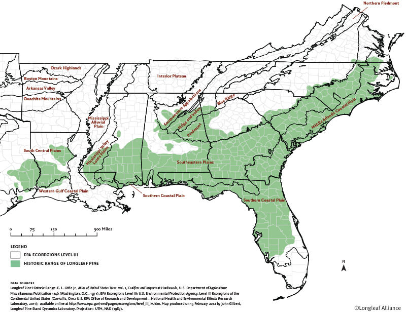 EPA ecoregions level III and historic range of longleaf pine, Map by Longleaf Alliance. Reproduced by permission of Longleaf Alliance.