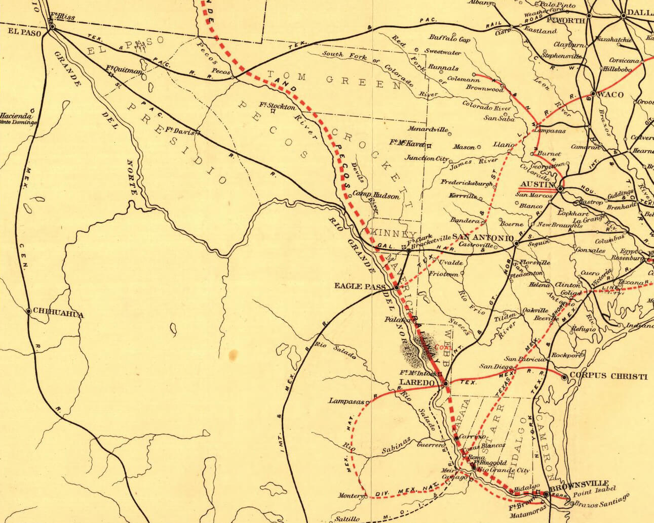 Rio Grande and Pecos Railway Company, Detail of a map of the Rio Grande and Pecos Railway showing the locations of Brownsville, Laredo, and Eagle Pass, 1882. Courtesy of Library of Congress Geography and Map Division, catalog number 98688791.