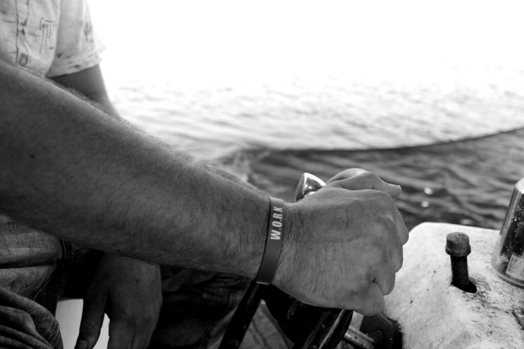 We want trawling in Lake Boudreaux at sunrise. One shrimper was from the days when men were shrimpers. His voice was deep and gravely enough to be heard over the boat's motors. He had an apprentice who wore a rubber bracelet with a single word: "Work." We came full of coffee thermoses because it was four in the morning. We were nervous about being too late for the launch.
