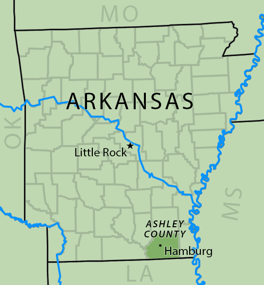 | Map of the Ark-La-Miss Borders. The Martins grew up in the town of Hamburg in Ashley County, Arkansas. Map by Southern Spaces. |