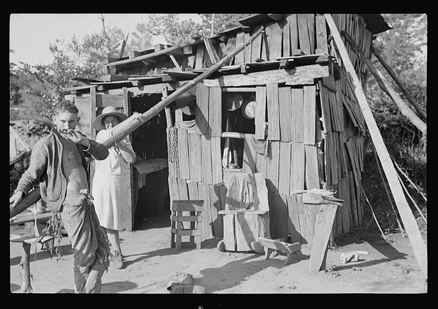 | Arkansas squatter's home, along Route 70, 1935. Photograph by Ben Shahn. Courtesy of the Library of Congress, Prints and Photographs Division, LC-USF33- 006029-M1 [P&P]. Despite the geographical and cultural variety found in the state, many common stereotypes about Arkansas treat all Arkansas natives as derivatives of the squatter. |