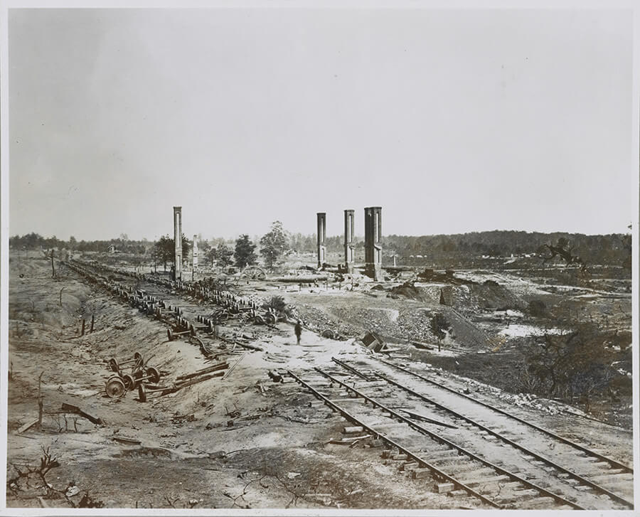 Union photographer George N. Barnard photographed Atlanta before, during, and after the damage wrought by Sherman's armies. Arriving in mid-September, Barnard produced well-known views of Atlanta's battlefields, fortifications, and businesses. One of the first scenes he photographed was the site of McPherson's death, a spot marked by an inscribed wooden placard nailed to a thin tree. Barnard revisited the site in November 1864 or May 1865, when he took a second set of photographs. In late September 1864, Barnard also devoted attention to General Sherman, who posed for portraits with his staff at a former Confederate fort west of the city. Barnard was particularly busy in October and early November 1864 when he created many of his best known images of the Atlanta and the fortifications surrounding it. He photographed homes that served as headquarters for Union officers, storefront businesses including a slave market on Whitehall Street (now Peachtree Street),61Michael Rose, Remembering Atlanta (Nashville: Turner Publishing Company, 2010), 17. the centrally located rail car shed, both before and after it was demolished, and teams of Yankee soldiers tearing up and twisting railroad track. Barnard's images provide an enduring impression of Civil War Atlanta and a stark record of the wreckage. Southern Spaces Logo