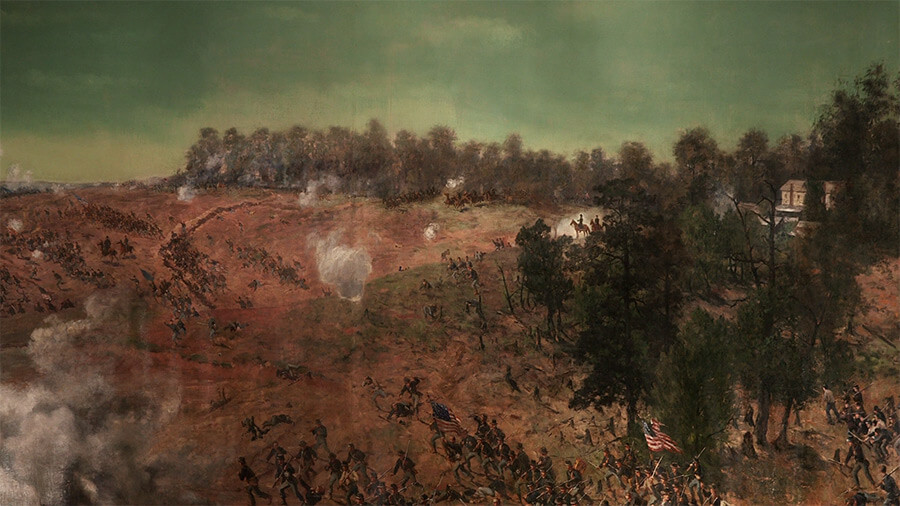 The Battle of Atlanta pitted Confederate and Yankee forces against one another in a large combat zone that extended over areas now known as East Atlanta, Kirkwood, Edgewood, Reynoldstown, Little Five Points, Inman Park, and Poncey-Highland. Busy highways, streets, and urban neighborhoods have long since transformed the battlefield terrain, but today's visitors can tour many topographic features, historic monuments and landmarks, as well as remnants of a Civil War fort and rifle pit. A visit to the Battle of Atlanta Cyclorama painting on display in Grant Park is an excellent accompaniment to the tour. The enormous artwork in the round, completed in 1885–86 using firsthand accounts of the fighting, illustrates the lay of land on July 22, 1864, and depicts the clash between Federal and Confederate troops in a particularly dramatic turning point, at about 4:30 in the afternoon. While some visitors prefer touring the Atlanta cyclorama before going to the battlefield sites, reversing that sequence and beginning with Civil War landmarks provides guidance to the sweeping troop movements, lines of attack, and contested terrain portrayed in the sprawling panorama.