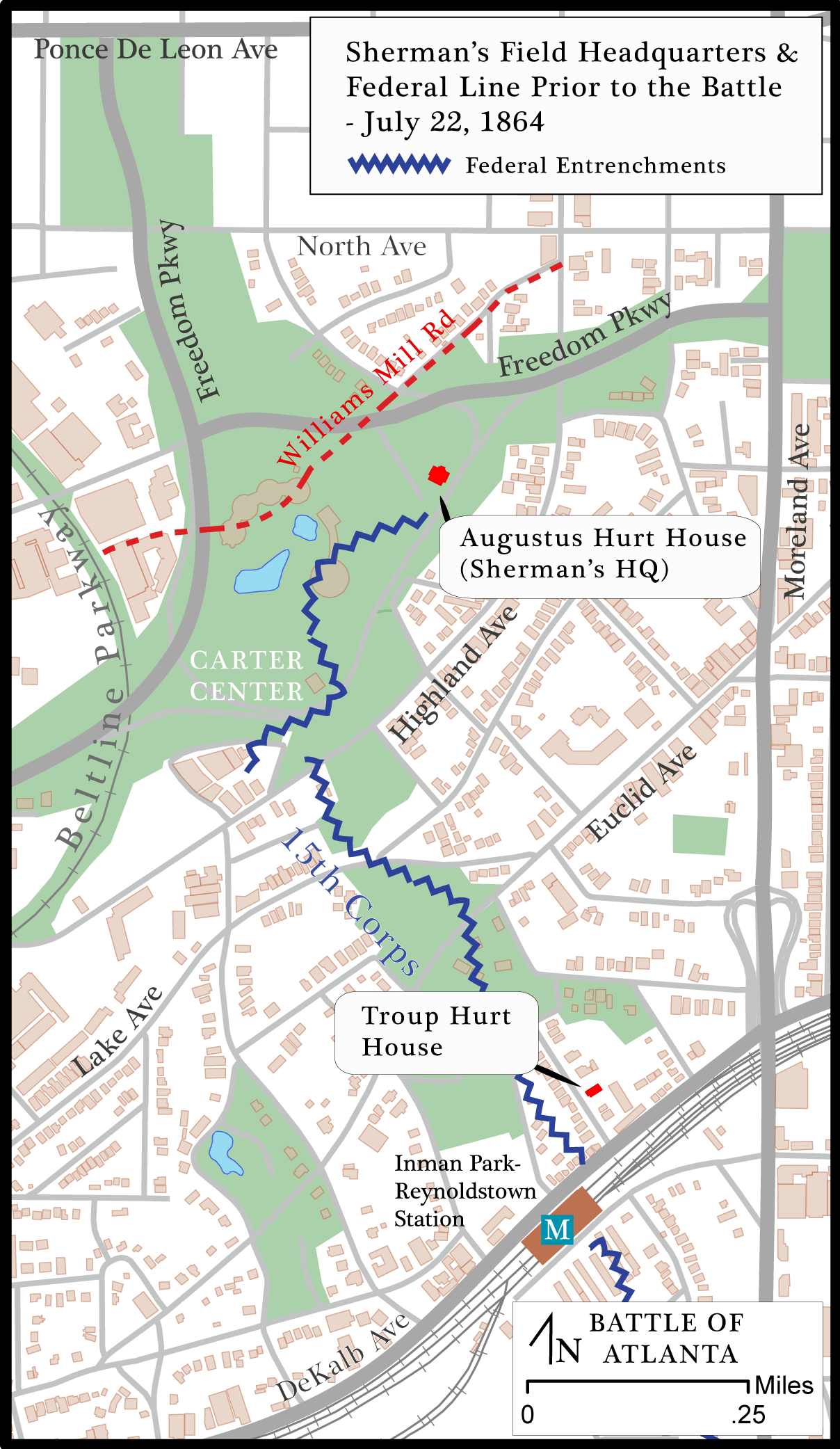 On the morning of July 22, 1864, Federal General William T. Sherman, commander of the three Union armies closing on Atlanta, rode on horseback from his field headquarters, a pitched tent at what is now the intersection of Briarcliff and North Decatur Roads, near the present-day Emory University campus, to temporary headquarters, two and one-quarter miles to the southeast and in closer proximity to the city's center. Sherman established his new command post at Augustus Hurt's two-story, wood-frame home and hill top plantation, located on the present-day site of the Jimmy Carter Presidential Library. In 1864, Hurt's estate was on cleared land and commanded a sweeping view to the west and south. When Sherman arrived, he ventured beyond the unoccupied home and down a hillside for a closer look at Atlanta. From a vantage point near the western edge of the present-day presidential library campus, Sherman used field glasses to view the city that was a prime objective of his military campaign. He scanned the eastern section of Atlanta's inner fortifications located about one mile away, along present-day Boulevard and Glen Iris Drive, and observed Confederate batteries and soldiers. This provided direct confirmation that the Rebels remained in Atlanta in force, in contrast to Sherman's earlier supposition—already contradicted by Union reconnaissance—that the Confederate army had evacuated the city.
