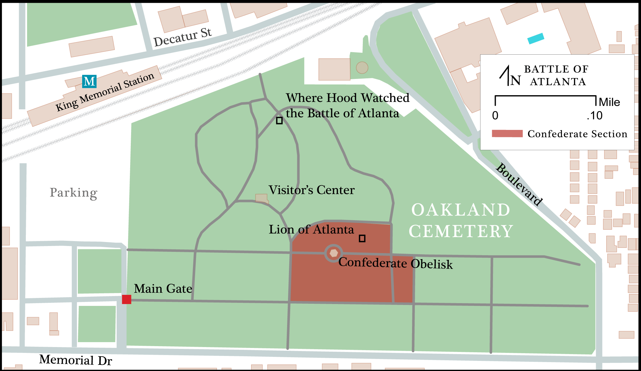 Oakland Cemetery, Atlanta, Georgia. Battle of Atlanta map by Michael Page, 2014.