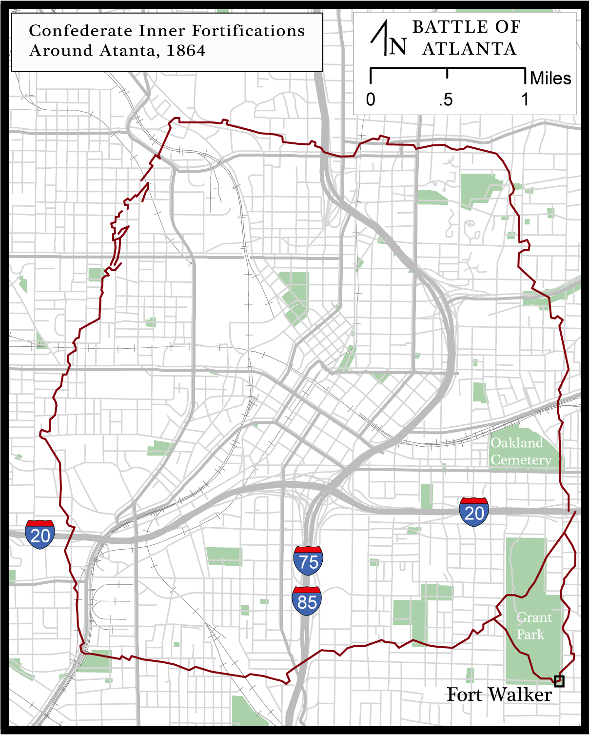 Confederate inner fortifications around Atlanta, 1864. Battle of Atlanta map by Michael Page, 2014.