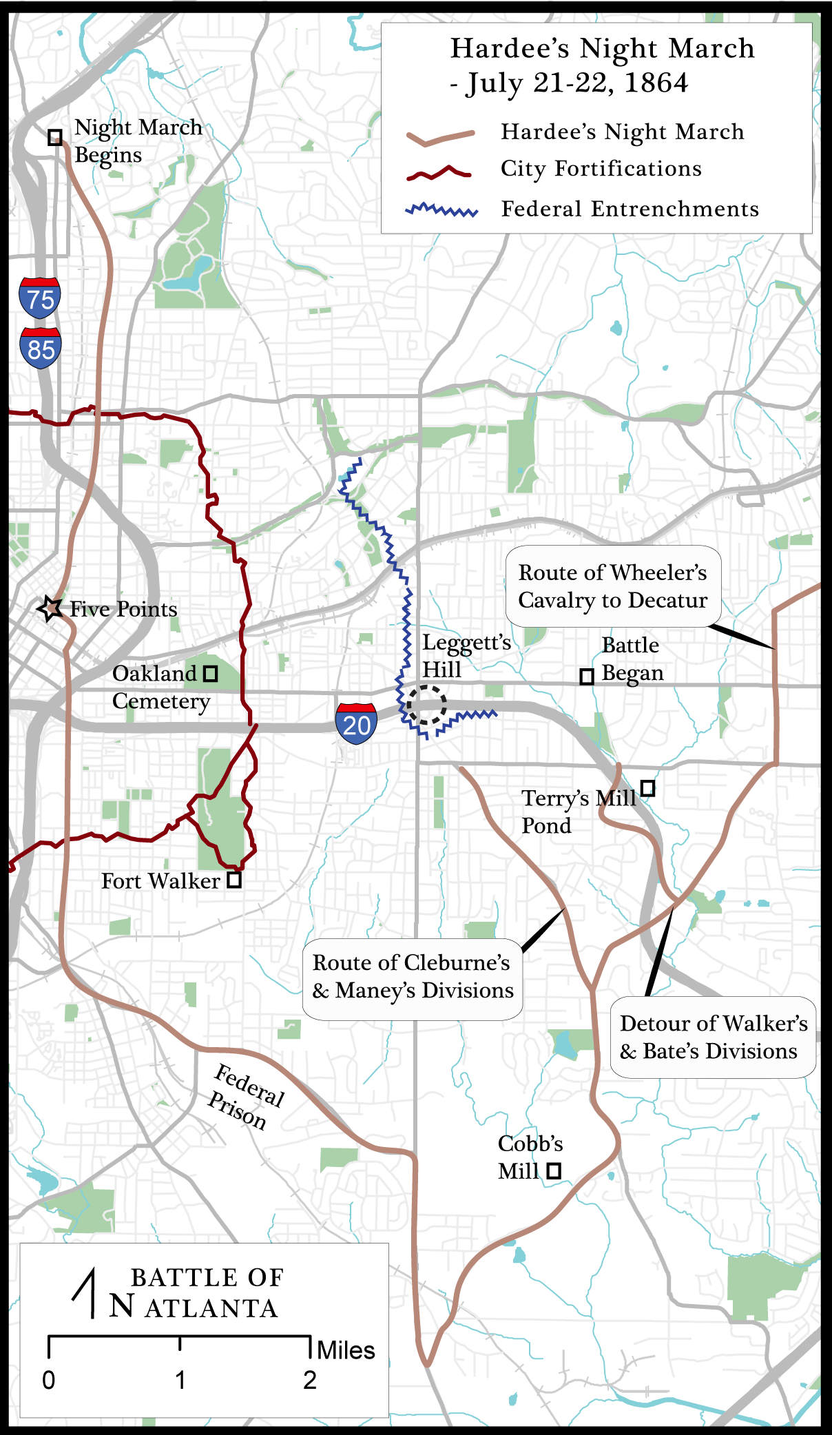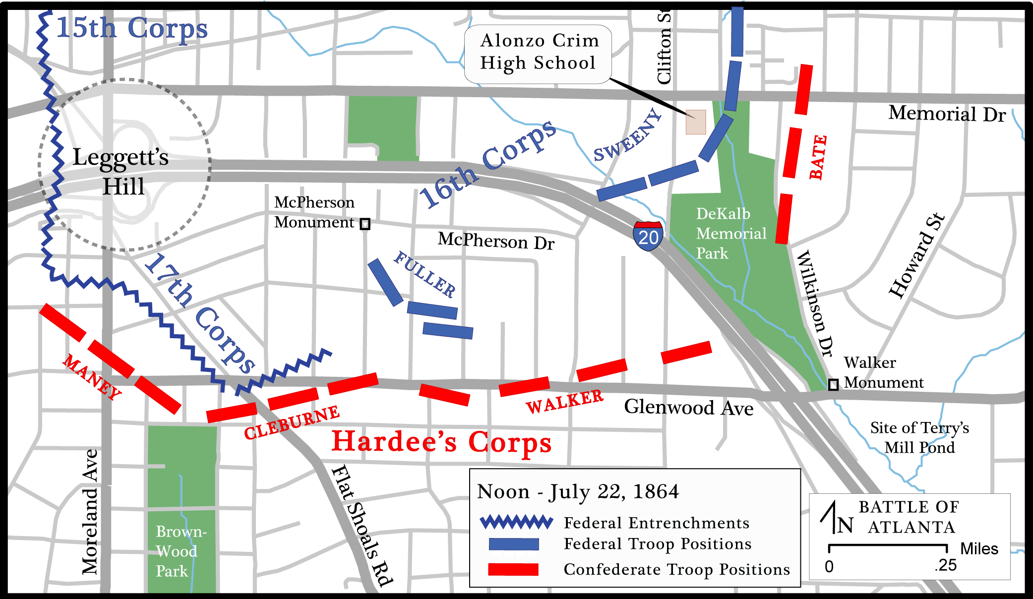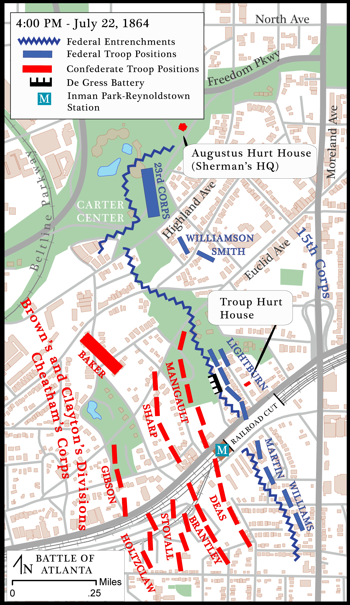 Sherman, traveling with Major General John M. Schofield's Army of the Ohio on the Federal left wing, had moved his headquarters early on July 20 to what is now the northwest corner of North Decatur and Briarcliff Roads. As the battle raged at Peachtree Creek, Union troops pressed toward the city: General James B. McPherson's Army of the Tennessee marching westward from Decatur towards Atlanta along the tracks of the Georgia Railroad and Schofield's Army of the Ohio moving from the northeast, to McPherson's right, reconnoitering the Confederate defenses, cutting roads, and opening communications. The only major action on July 21 occurred when McPherson ordered General Frank P. Blair, leading the Seventeenth Corps of the Army of the Tennessee, to capture Bald Hill, an elevation commanding the eastern approach to the city that the Confederate defenders used to hold McPherson's advancing troops at bay. On the morning of July 21, General Mortimer Leggett's division of Blair's Corps, after a bitter struggle, captured the hill—later re-named Leggett's Hill—from a Confederate division under the command of General Patrick R. Cleburne of Hardee's Corps. Leggett's troops immediately entrenched themselves and placed cannons in position to fire shells into Atlanta. By nightfall, the Federal left wing had advanced to a lengthy front some two-and-a-half miles from the center of Atlanta on what had been the eastern portion of the Confederates' outer defense line. The Confederates abandoned that entire line overnight, withdrawing to the city's inner fortifications, and allowing Sherman to move to his new headquarters at the Augustus Hurt House the following morning, July 22, 1864.