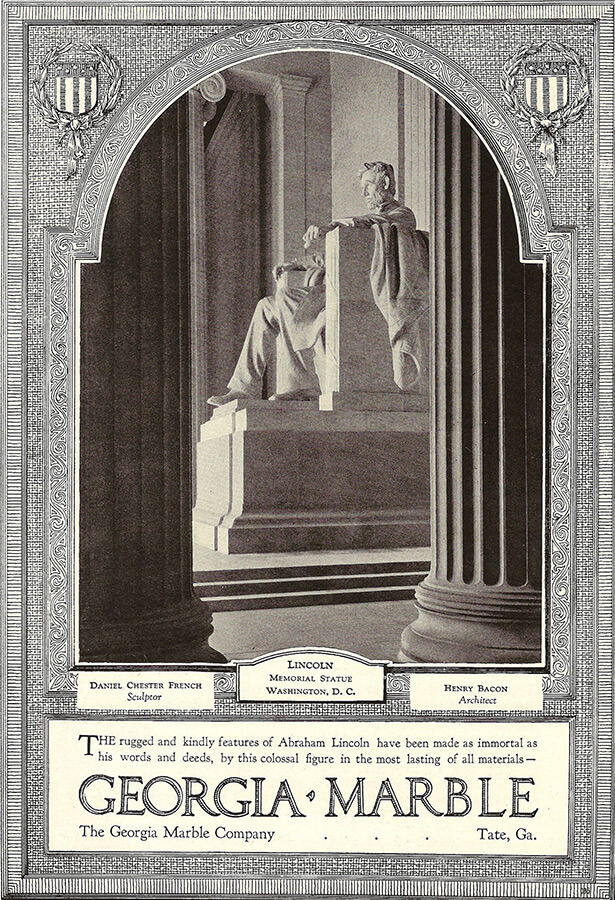 Lincoln Memorial in Washington, DC, sculpted from Tate, Georgia, marble, February 1, 1928. Advertisement from National Geographic.