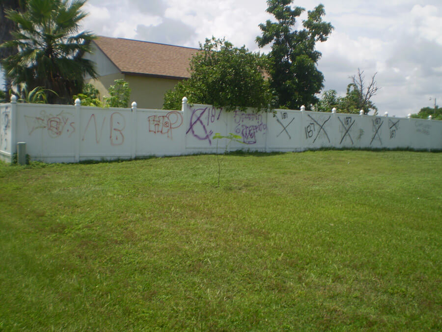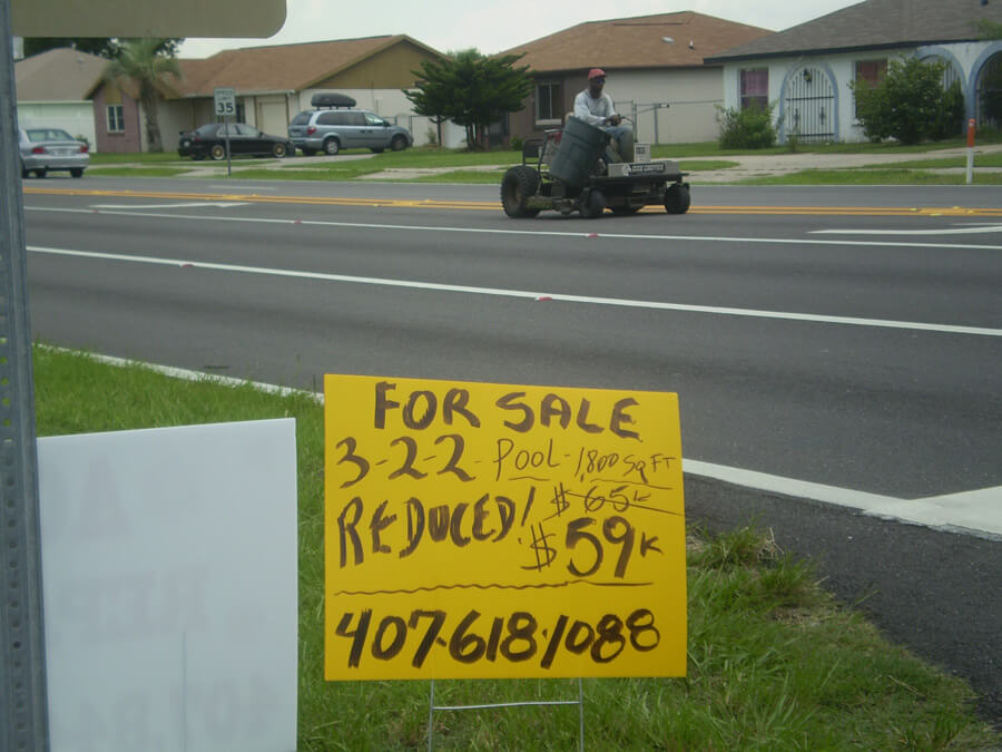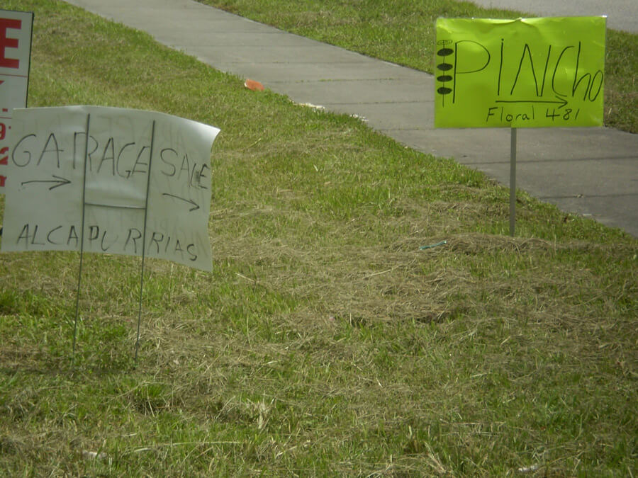 | Graffiti, Spanish signage, and For Sale sign, Buenaventura Lakes, Florida, 2010. Photographs by Simone Delerme. | ||