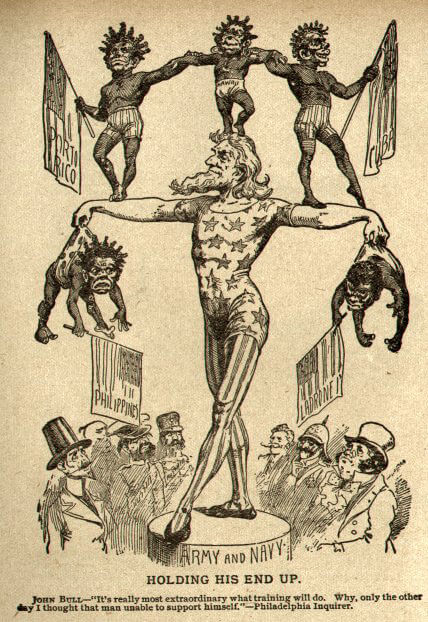 | "Holding His End Up," Philadelphia Inquirer, ca. 1899. Political cartoon depicting Puerto Rico, Hawaii, Cuba, the Philippine and Mariana Islands as spoils of the Spanish–American War. |