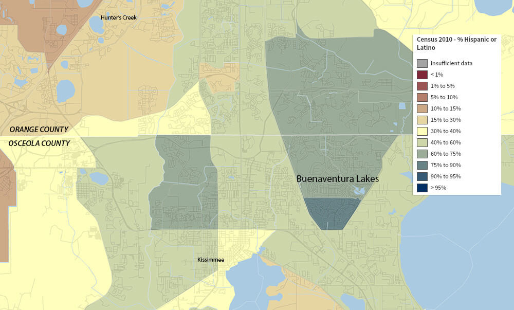 | Buenaventura Lakes, Florida. Data from the 2010 Census, Hispanic population according to census tract. Map courtesy of Southern Spaces. |