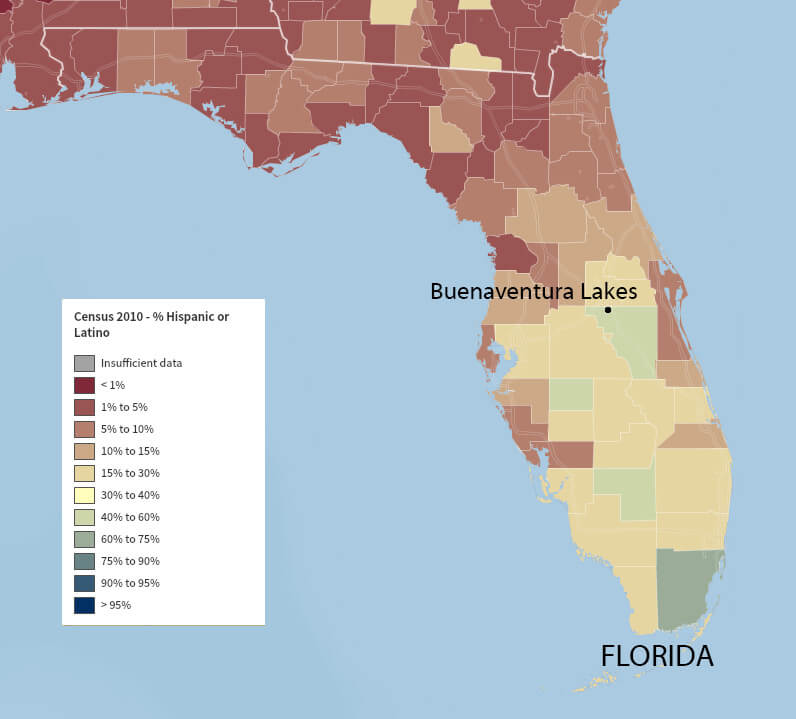 | Buenaventura Lakes, Florida. Data from the 2010 Census, Hispanic population according to county. Map courtesy of Southern Spaces. |