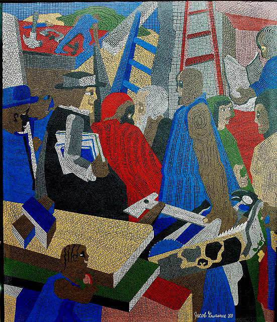 Community, ceramic tile mosaic on lobby wall of the Joseph P. Addabbo Federal Building, Jamaica, Queens, New York by Jacob Lawrence, 1989. Photograph of mosaic by Carol M. Highsmith. Courtesy of Library of Congress, Prints and Photographs Division, Carol M. Highsmith Archive, LC-DIG-highsm-02817.