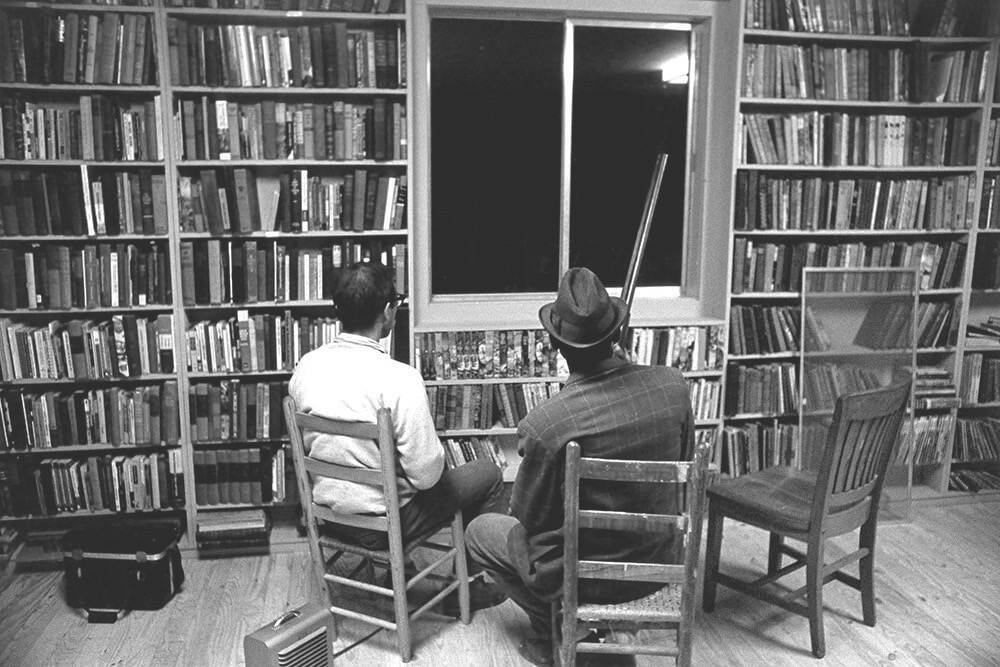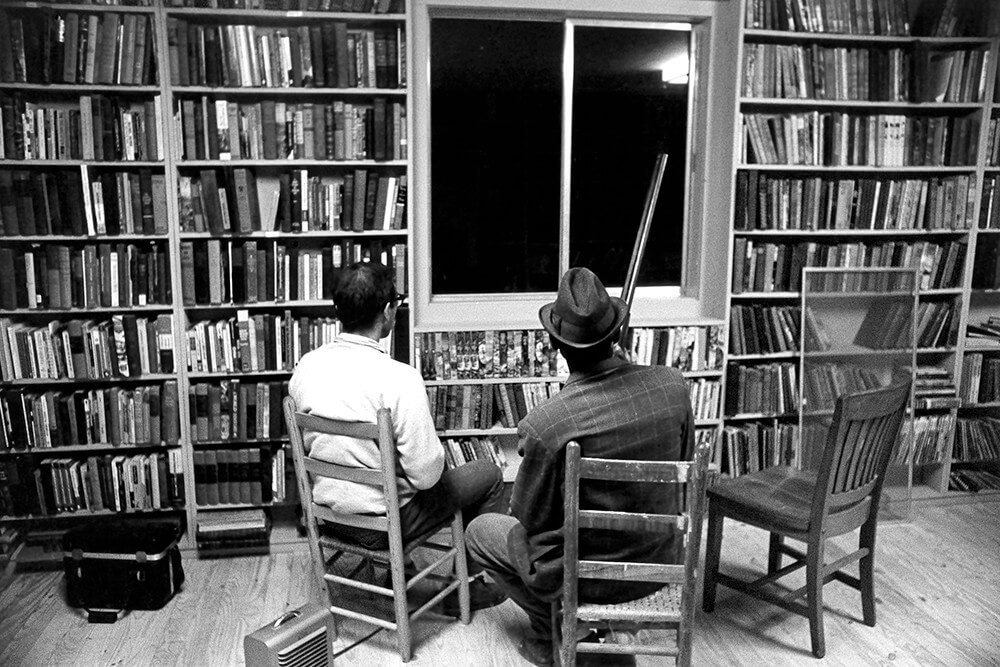 "Fire Bomb Watch, Mileston, Mississippi, June 1, 1964." Community center construction, Freedom Summer, Mileston, Mississippi, June, 1964. Photograph by Matt Herron. Copyright by Matt Herron/Take Stock/The Image Works. Mileston Summer volunteer carpenter, Jim Boebel, and a local resident post a shotgun watch at the community center against a fire bomb threat by local whites. Threats were common that summer and local men took turns guarding the community every night. All rights reserved.