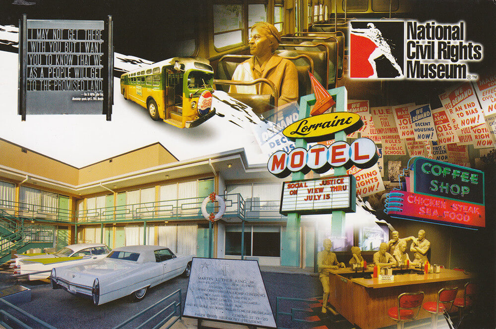 Postcard featuring iconic images and paraphernalia from the civil rights movement, sold at the National Civil Rights Museum, Lorraine Motel, Memphis, Tennessee, March 31, 2013. Photograph of postcard courtesy of Erick Alvarado. © Erick Alvarado, 2013.