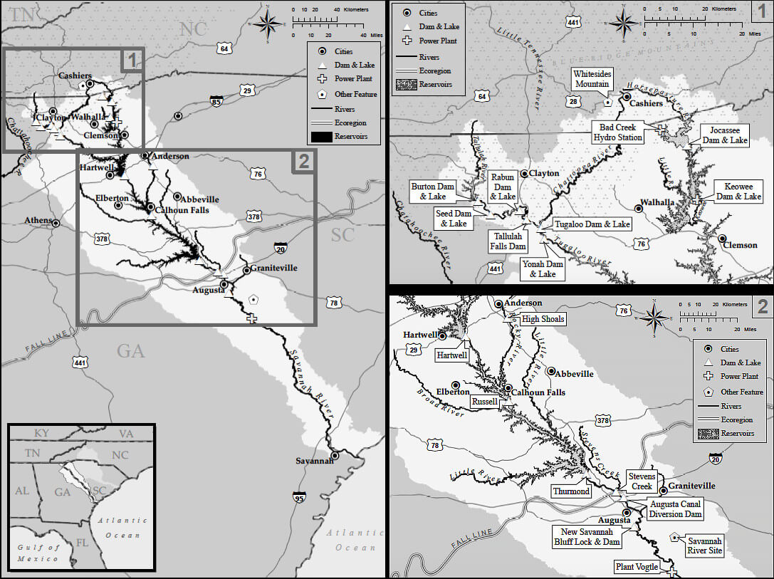 Detail of the Savannah River basin, 2013. Map by Amber R. Ignatius, from Southern Water, Southern Power: How the Politics of Cheap Energy and Water Scarcity Shaped a Region by Christopher J. Manganiello. Copyright © 2015 by the University of North Carolina Press. Used by permission of the publisher. www.uncpress.unc.edu.