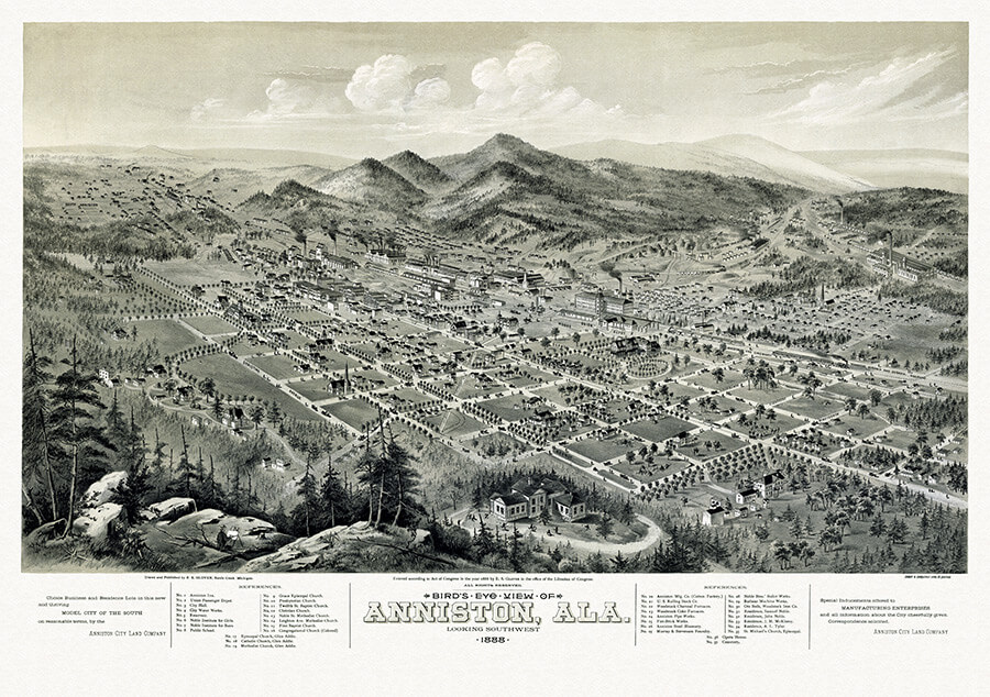 "A Bird's Eye View," Anniston, Alabama, 1888. Lithograph by E. S. Glover. An artistic rendering of Anniston, "the model city of the South," this drawing shows the smokestacks of the industrial district and Coldwater Mountain in the distance. While the founder's residences occupy the left foreground, the "Colored" Congregational Church lies to the right, within a few blocks of the Woodstock Coke Furnaces and the Anniston Pipe Works. Reproduced from Baptized in PCBs, 21. Courtesy of Ellen Spears.