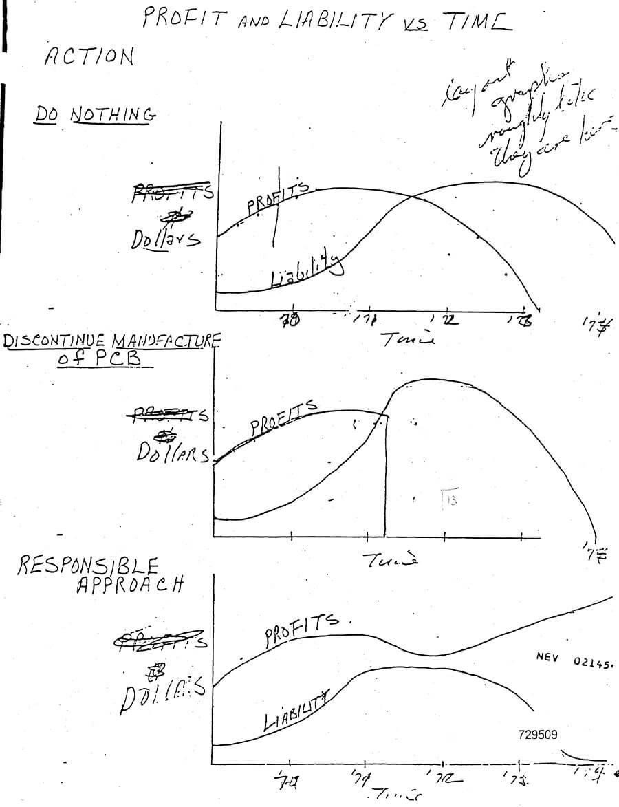 "Profit and Liability vs. Time," October, 1969. Chart by Monsanto's Ad Hoc Committee for the Defense of Aroclors. Document from Abernathy v. Monsanto, Etowah County Courthouse, Gadsen, Alabama. This hand-drawn chart outlines the profits and liability outcomes associated with three options for addressing Monsanto's increasingly public PCBs problem: "Do Nothing," "Discontinue Manufacture of PCB," and lastly, "Responsible Approach." Reproduced from Baptized in PCBs, 144. Courtesy of Ellen Spears.