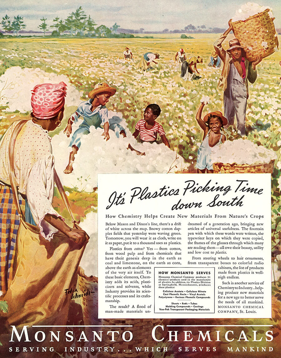 "It's Plastics Picking Time Down South," Fortune Magazine, September, 1939. Artwork by Felix Schmidt. An example of Monsanto's early public relations campaign, this advertisement links labor, synthetic chemicals, and nature through the racialized imagery of the cotton industry. Reproduced from Baptized in PCBs, 76. Courtesy of Ellen Spears.