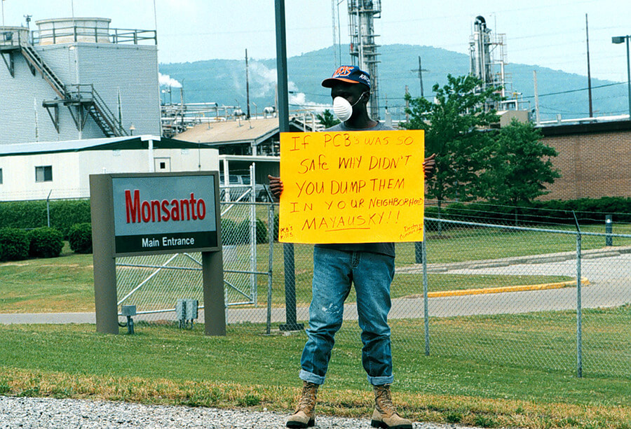 PCB Activist Herman Frazier protests Monsanto's Sweet Valley/Cobbtown relocation plan, Anniston, Alabama, 1996. Photo by Bill Wilson, Anniston Star. Reproduced here from Baptized in PCBs, 76. Courtesy of Ellen Spears.