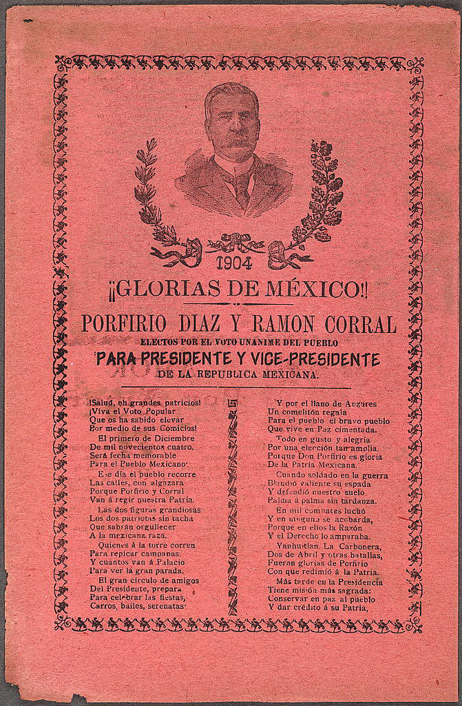 Glorias de México!, with bust portrait of Porfirio Díaz, Mexico City, 1904. Broadside, on recto, by Antonio Vallegas Arroyo and José Guadalupe Posada. Courtesy of the Caroline and Ewan Swann Collection, Library of Congress Prints and Photographs Division, LC-DIG-ppmsc-04473.