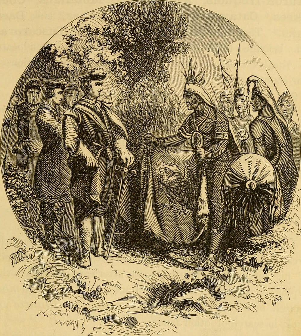 Meeting of White Men and Indians, General Oglethorpe meeting Creek Nation. Print originally published in John Lossing's An Outline History of the United States (Sheldon & Co, 1881), p. 19. Image uploaded by Flickr user Internet Archive Book Images. Image is in public domain.