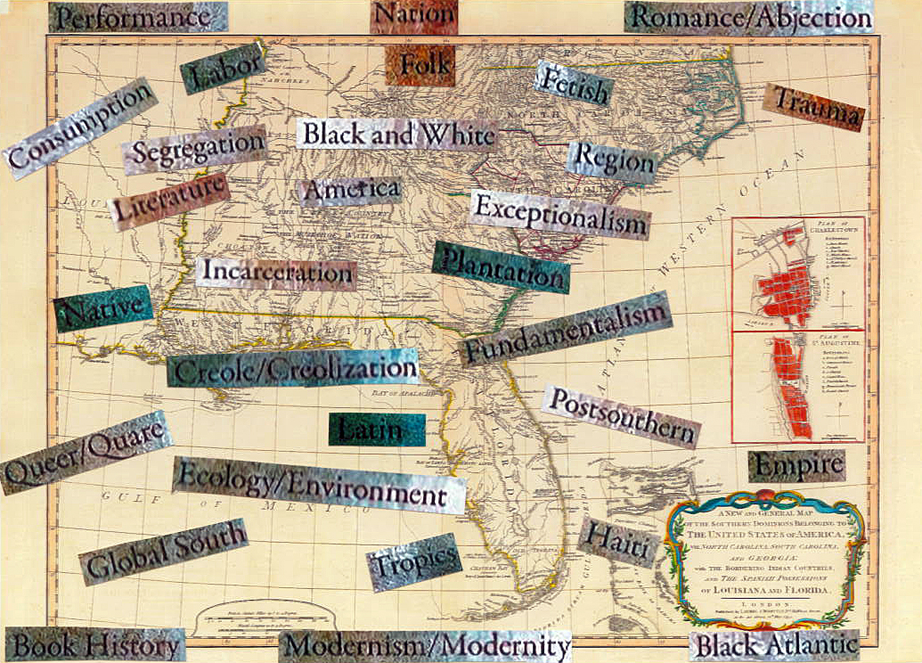 Remappings and Keywords. Historic map, "A new and general map of the Southern dominions belonging to the United States of America," 1794, courtesy of Flickr user Mississippi Department of Archives and History. Adapted by Eric Solomon. Contributors "interrogate new approaches that have broadened the archive and conceptual scope of southern (and American) studies. They investigate the structures of feeling that continue to consolidate and dissolve various Souths, remapping the gap between 'real place' and space as it is configured affectively."