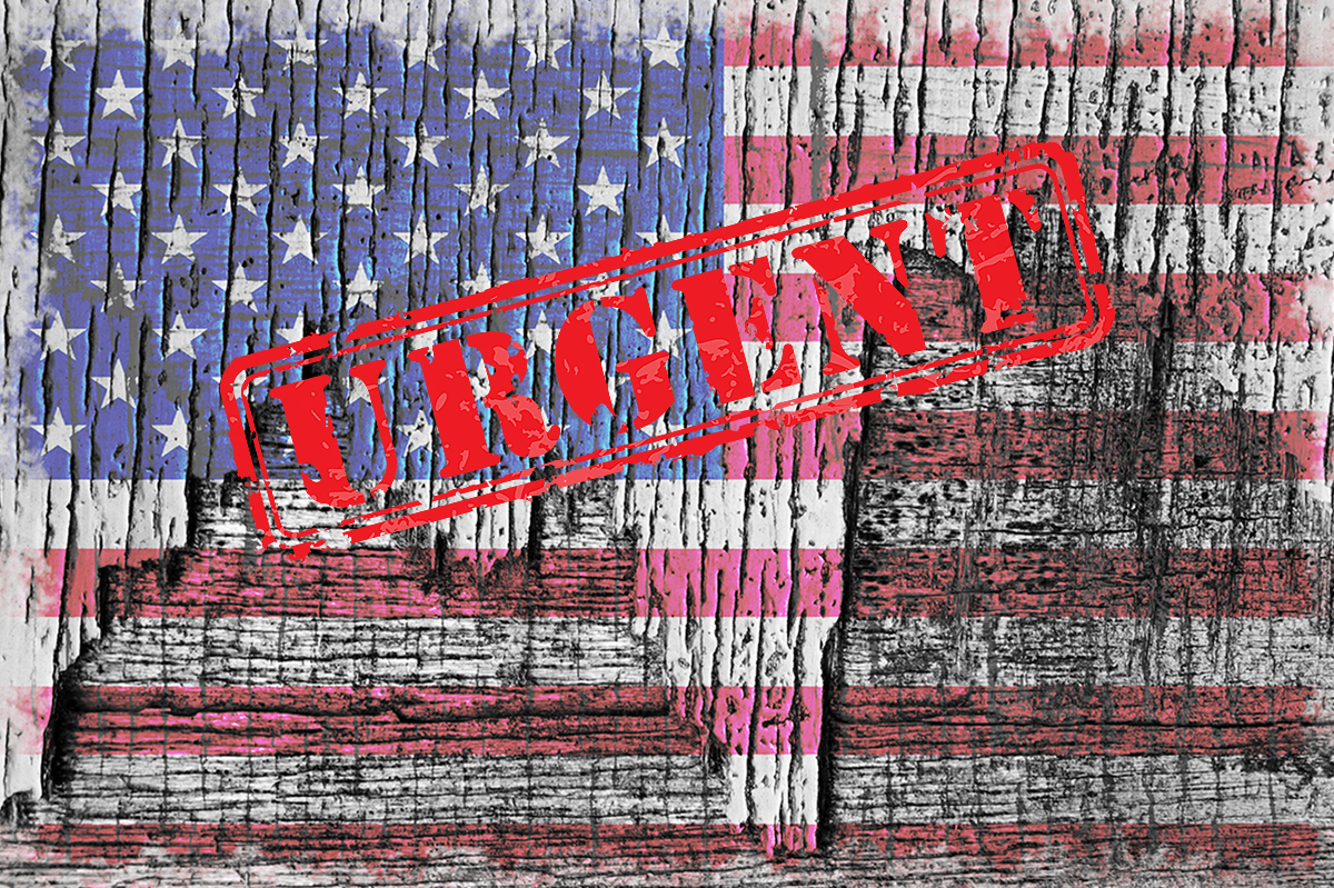 Urgent America. Flag photograph, January 24, 2009, courtesy of Flickr user Beverly and Pack. Creative Commons license CC BY-NC 2.0. Adapted by Eric Solomon. "Many of [the essays] share a note of urgency."
