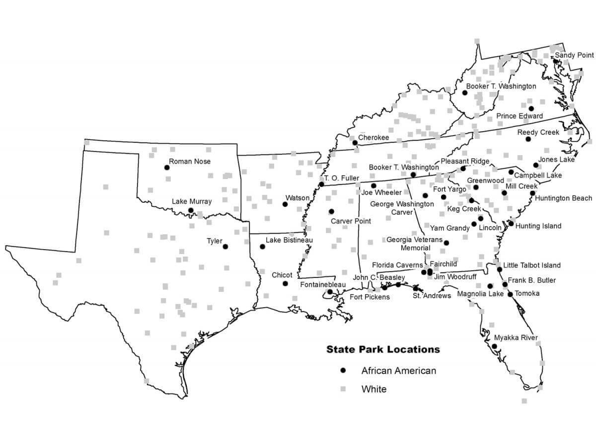 Locations of state parks in the South highlighting facilities made available to African Americans between 1937 and 1962. Map by William O’Brien. Originally published in William O’Brien’s Landscapes of Exclusion: State Parks and Jim Crow in the American South (Amherst: University of Massachusetts Press, 2015). Image provided by author.