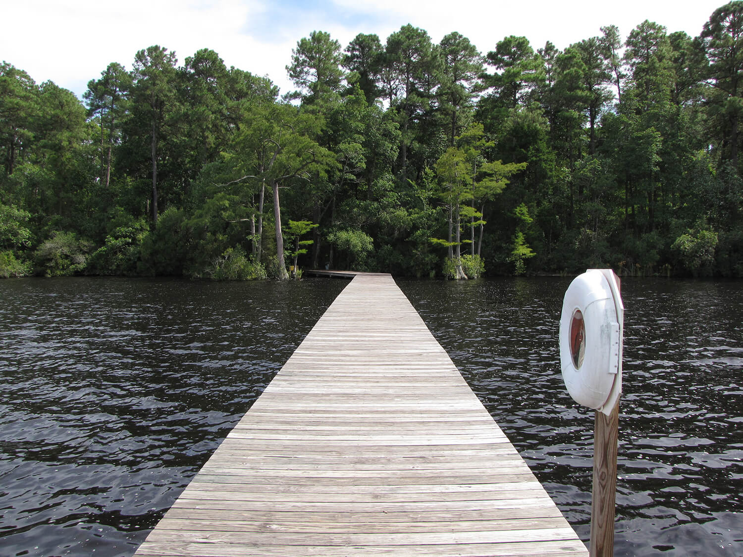Top, Jones Lake State Park, Bladen County, North Carolina, ca. 1940. Photograph by unknown creator, North Carolina Division of Parks and Recreation. Courtesy of the North Carolina Division of Parks and Recreation Records collection, State Archives of North Carolina, North Carolina Digital Collections, State Library of North Carolina. Bottom, Jones Lake State Park Fishing Pier, Bladen County, North Carolina, August 25, 2013. Photograph by Flickr user Gerry Dincher. Creative Commons license CC BY-SA 2.0.