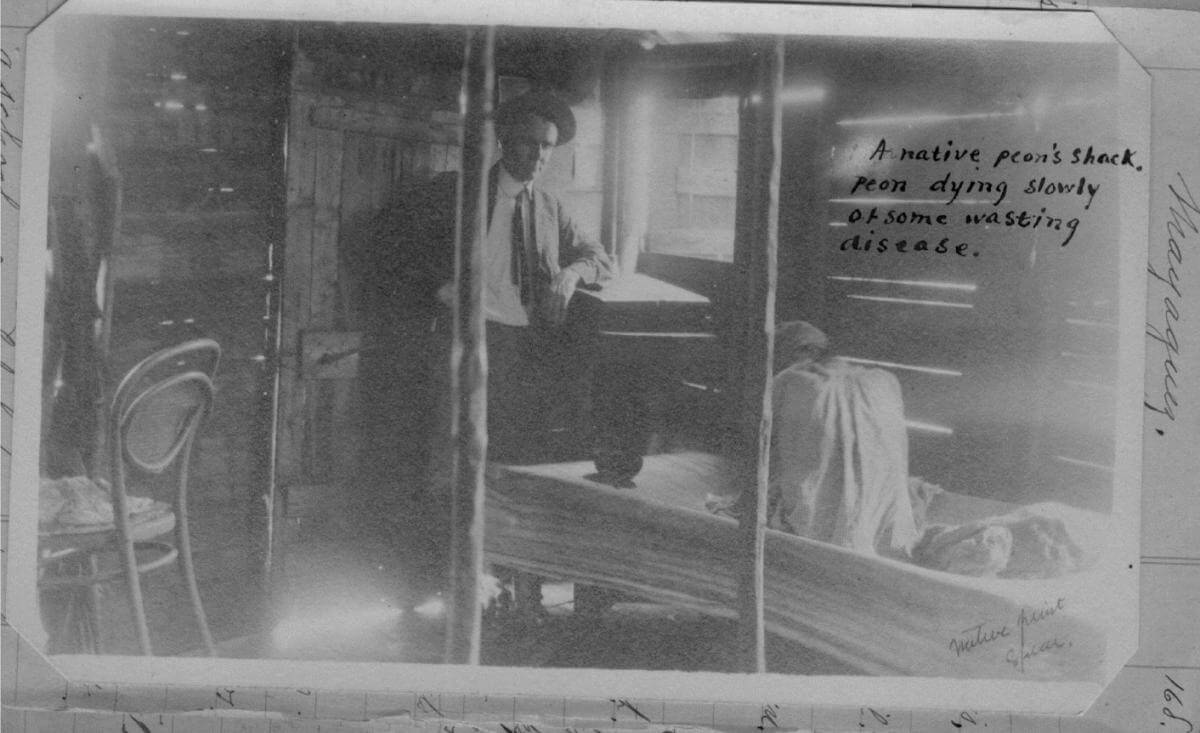 This interior photograph shows a sick "peon" in the presence of an unknown observer, who does not resemble Armstrong in appearance or dress. Anemia caused by hookworm decimated Puerto Rican rural workers. After the discoveries of Dr. Bailey Ashford, an effective clinical treatment became available in 1904.1For more on Ashford and hookworm eradication, see José Amador, "The Pursuit of Health: Colonialism and Hookworm Eradication in Puerto Rico," Southern Spaces, March 30, 2017, https://ssredesign.ecdsdev.org/2017/pursuit-health-colonialism-and-hookworm-eradication-puerto-rico. This photograph from 1910 suggests the continuing misery of rural workers under the colonial state. The observer appears detached from and indifferent to the suffering of the hunched, dying man. Armstrong, in an ominous field book note, suggested that in the on-going process of "Americanization" it might be better if the unfit inhabitants simply "died off."