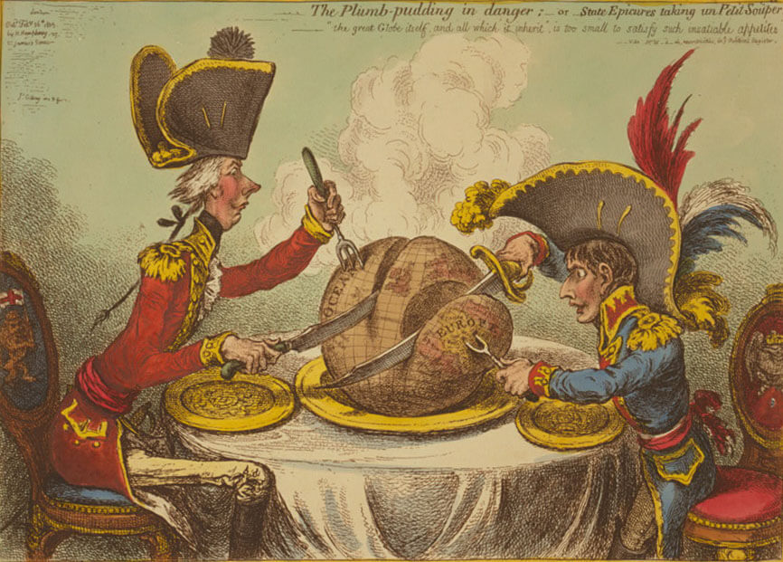 The Plumb-pudding in danger, a political cartoon depicting US and European imperialism, February 26, 1805. Cartoon etching by James Gillray. Courtesy of the Library of Congress Prints and Photographs Division, loc.gov/resource/cph.3g08791/.