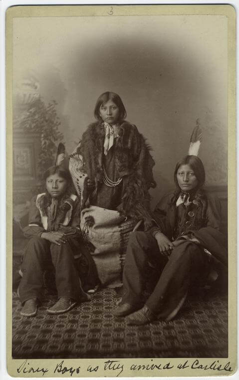 Sioux boys as they arrived at Carlisle, Pennsylvania, ca. 1892. Photograph by unknown creator. Courtesy of New York Public Library Art and Picture Collection Division, digitalcollections.nypl.org/items/510d47e1-1b90-a3d9-e040-e00a18064a99.