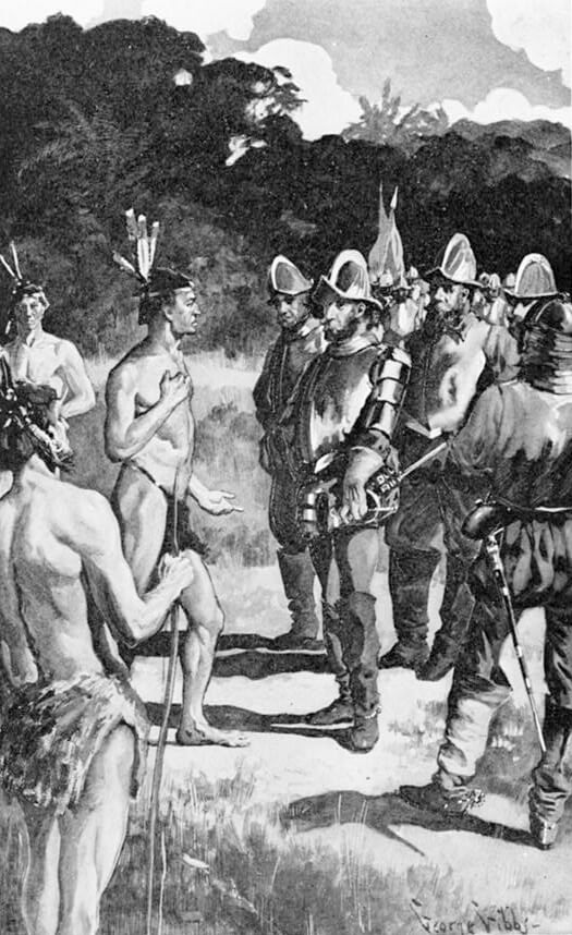 Top: De Soto and Vitachuco, 1898. Image by George Gibbs. Originally published in Grace King's De Soto and his Men in the Land of Florida (The Macmilliam Company, 1898). Courtesy of the Library of Congress Prints and Photographs Division, loc.gov/resource/cph.3c04322/.