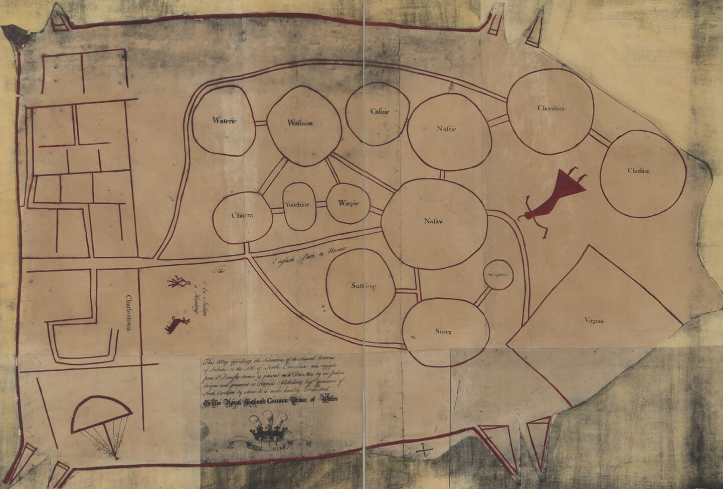 Catawba deerskin map of the nations of Native Americans to the Northwest of South Carolina following the Yamasee War, ca. 1724. Map by Francis Nicholson. Courtesy of the Library of Congress Geography and Map Division, loc.gov/resource/g3860.ct000734/.