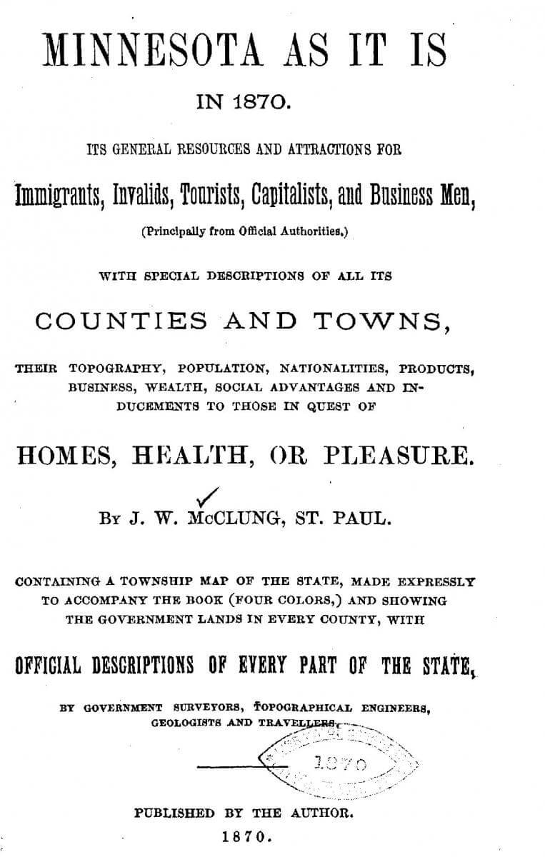 Cover page of J.W. McClung's Minnesota as it is in 1870, (St. Paul, Minnesota, 1870). Courtesy of the Library of Congress General Collections and Rare Book and Special Collections Division, loc.gov/resource/lhbum.01092/?sp=1.