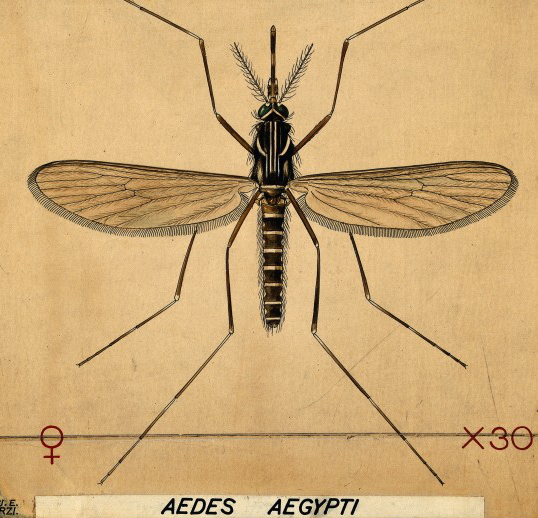 Top, Aedes aegypti mosquito, August 20, 2012. Colored drawing by A.J.E. Terzi. Image uploaded by Flickr user Wellcome Images. Creative Commons license CC BY-NC-ND 2.0. Bottom, Electron microscope image of the virus responsible for yellow fever, August 7, 2013. Photograph by Alain Grillet. Image uploaded by Flickr user Sanofi Pasteur. Creative Commons license CC BY-NC-ND 2.0.