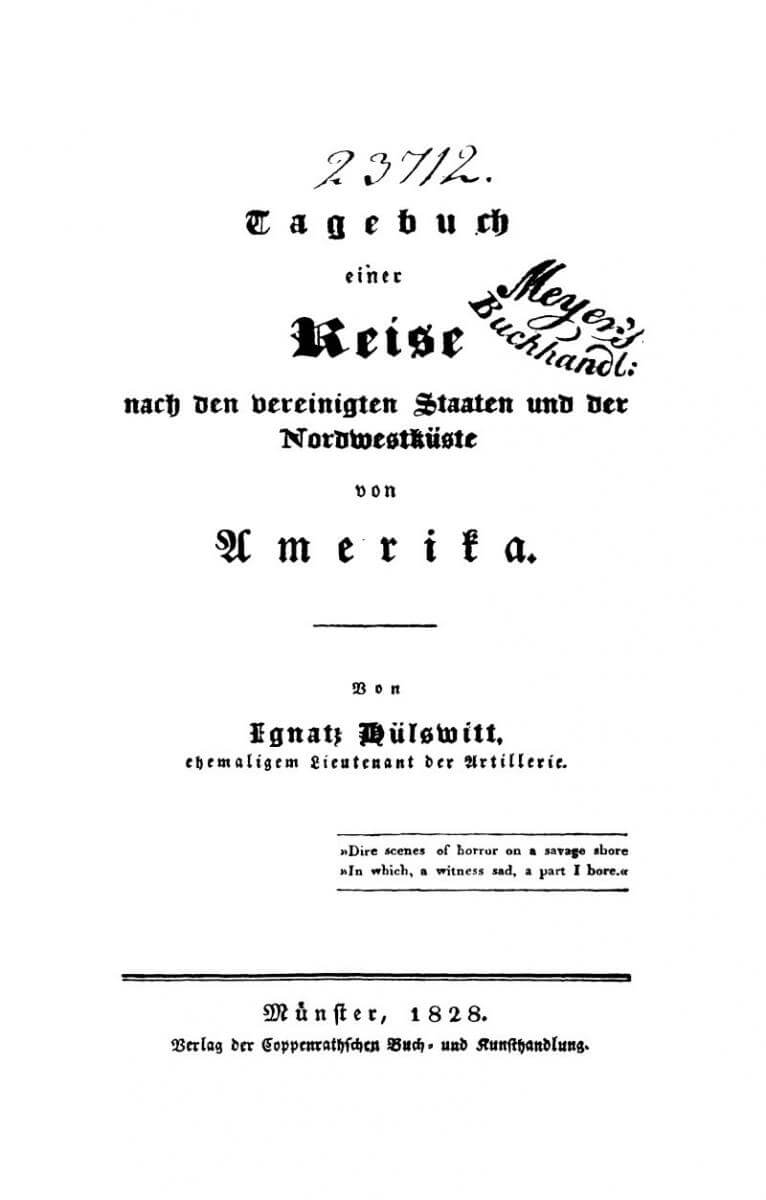 | 35. | Ignatz Hülswitt, Tagebuch einer Reise nach den Vereinigten Staaten und der Nordwestküste von Amerika (Münster, Germany: Coppenrathschen Buch und Kunsthandlung, 1828), 306, 308. |