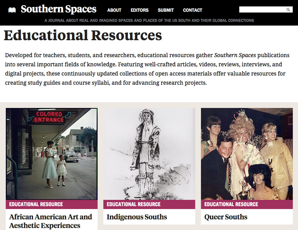 The Educational Resources section of our website—navigable by clicking "Browse" on the Southern Spaces navigation bar, selecting "Educational Resource" in the menu that appears at the left, then clicking "More"—currently features eight curated educational resources, with more collections forthcoming as the journal continues to innovate in critical regional studies, digital scholarship, and open access publishing.
