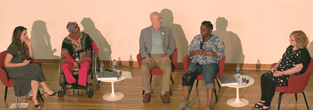 A photograph of four women and one man sitting on a stage in front of a white backdrop. One of the women speaks into a microphone; the others are turned towards her, listening.