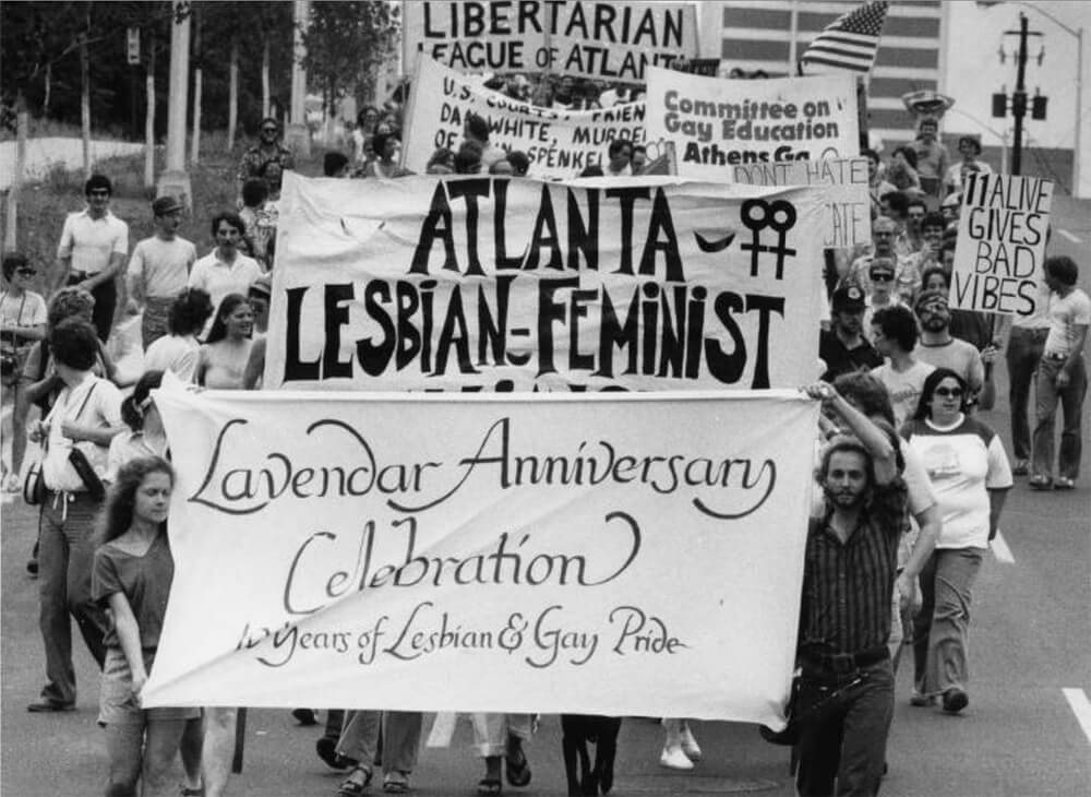Members and supporters of Atlanta's Gay Community parade down Peachtree Street, Atlanta, Georgia, June 26, 1979. Photograph by Calvin Cruce. Courtesy of Georgia State University Library, Atlanta Journal-Constitution Archives.