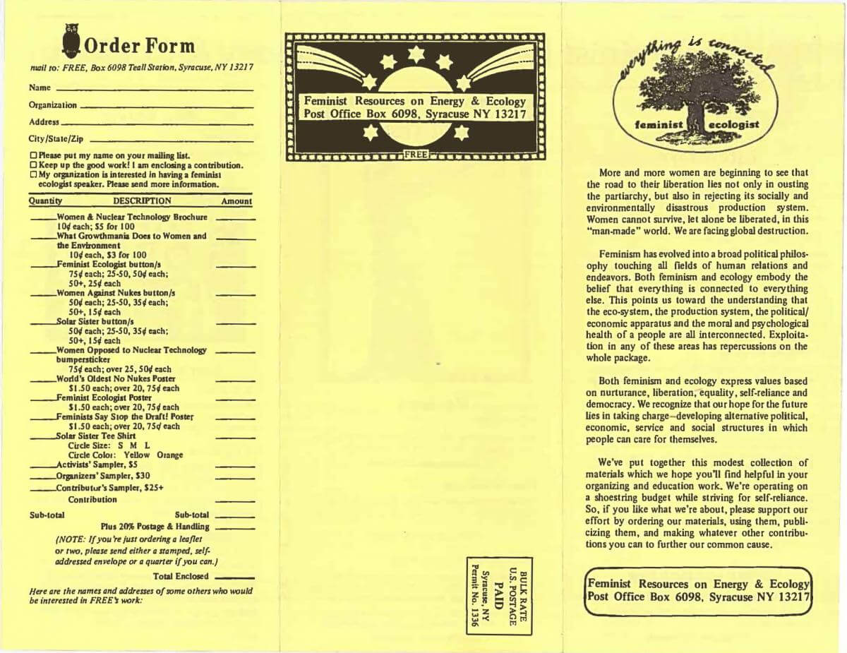 Top and Bottom, Feminist Resources on Energy & Ecology brochure (Syracuse, NY: Solar Sister). Courtesy of Utica College - Center for Historical Research, Oneida County Black History Archive, and For the Good, Inc.