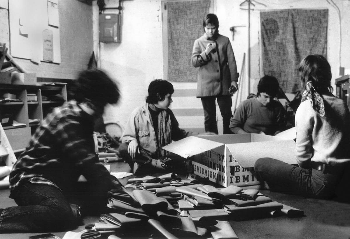 Members of The Furies Collective packing papers in their office basement, Washington, DC, ca. 1971. Photograph by Joan E. Biren. Courtesy of Joan E. Biren and the Sophia Smith Collection of Women's History. From left to right: Ginny Berson, Susan Baker (not a collective member), Coletta Reid (standing), Rita Mae Brown, and Lee Schwing.