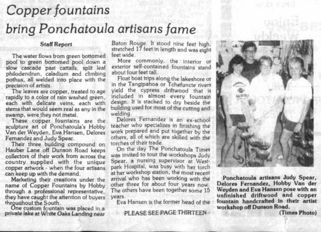 23. "Copper Fountains Bring Ponchatoula Artisans Fame," Ponchatoula Times, July 31, 1986, http://ptl.stparchive.com/pageimage.php?paper=PTL&year=1986&month=7&day=31&page =1&mode=F&base=PTL07311986P01&title=The%20Ponchatoula%20Times.
