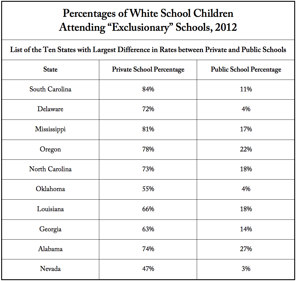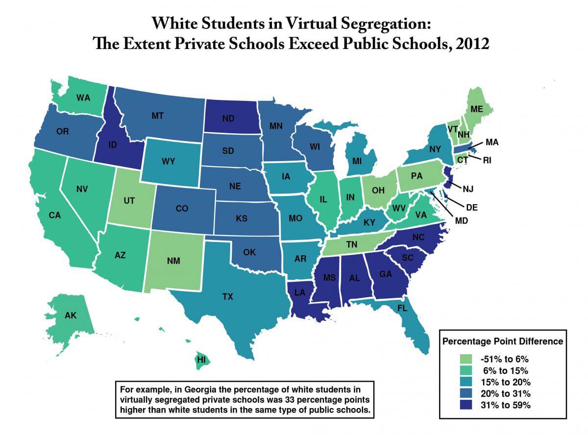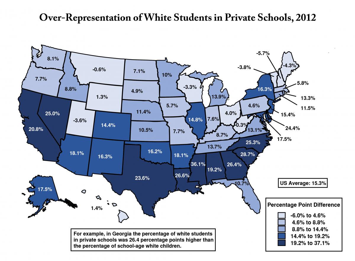 Over-Representation of White Students in Private Schools, 2012. Map by Steve Suitts. Map based on author's computations of National Center for Education Statistics data, 2012. Courtesy of the Southern Education Foundation.