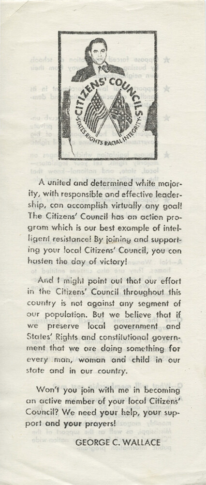 Support Your Citizens' Council, ca. 1954. Advertisement by the Association of Citizens' Councils of Mississippi. Courtesy of the Citizens' Council Collection, Archives and Special Collections, University of Mississippi Libraries.