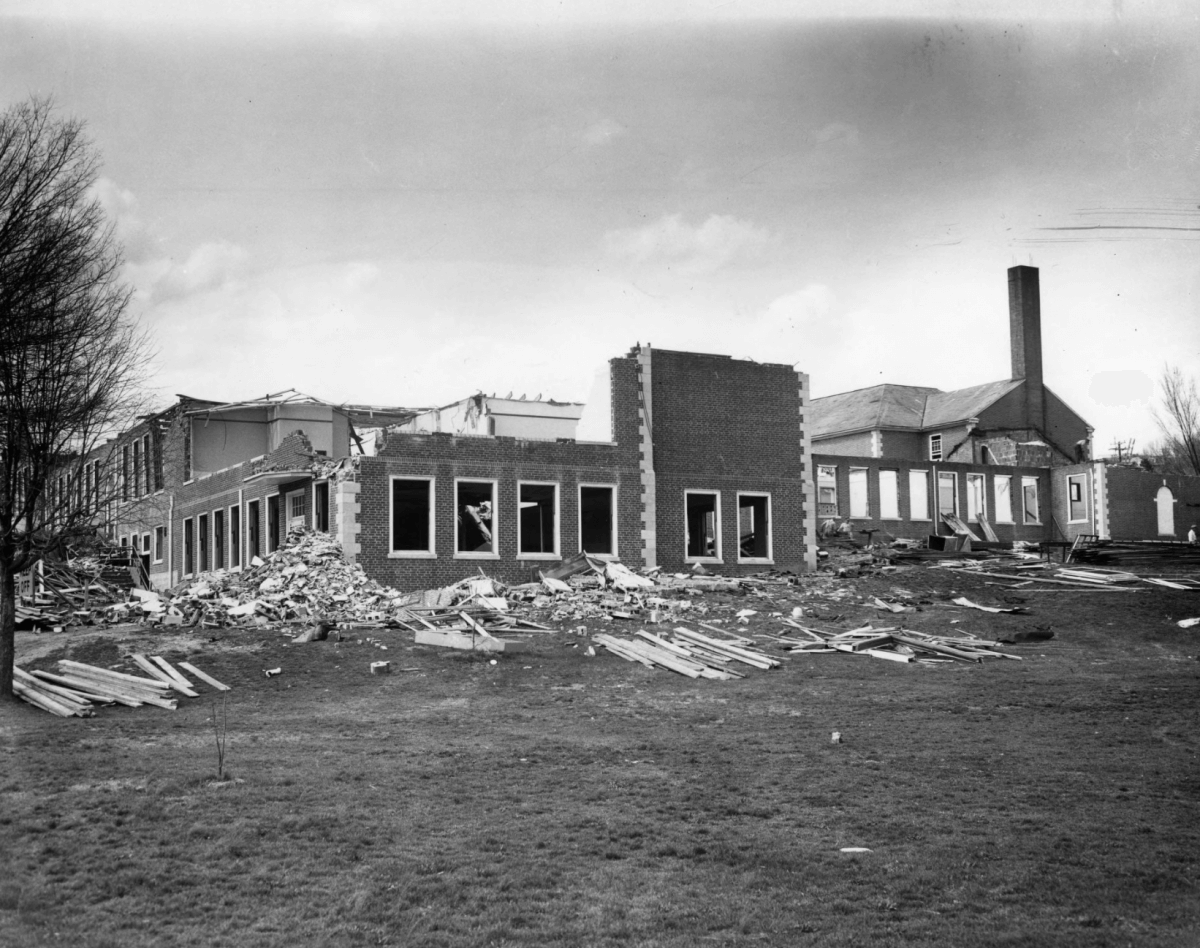 Clinton High School after bombing, Clinton, Tennessee, 1958. Photograph by unknown creator. Originally published in the Knoxville Journal. An estimated 75 to 100 sticks of dynamite exploded throughout Clinton High School in the early morning of Sunday, October 5, 1958, over two years after the desegregation of the high school. Despite the establishment of an FBI office in Clinton and a thorough investigation, no arrests were ever made in the case. Courtesy of the McClung Historical Collection, Knox County Public Library, University of Tennessee–Knoxville Libraries.