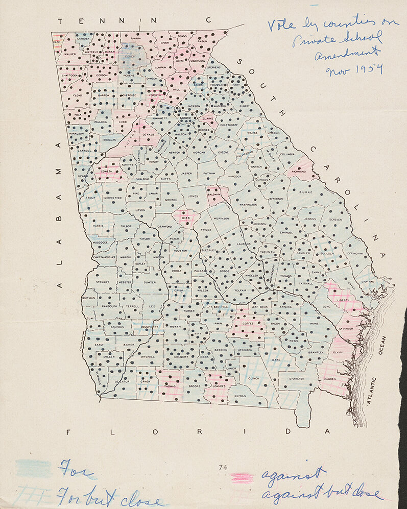 Vote by counties on private school amendment, Georgia, November 1954. Map by unknown creator. According to the map's key, shaded blue signifies "For," checkered blue signifies "For but close," shaded pink signifies "Against," and checkered pink signifies "Against but close." Courtesy of the Beverly Long Papers, Stuart A. Rose Manuscript, Archives, and Rare Book Library, Emory University.