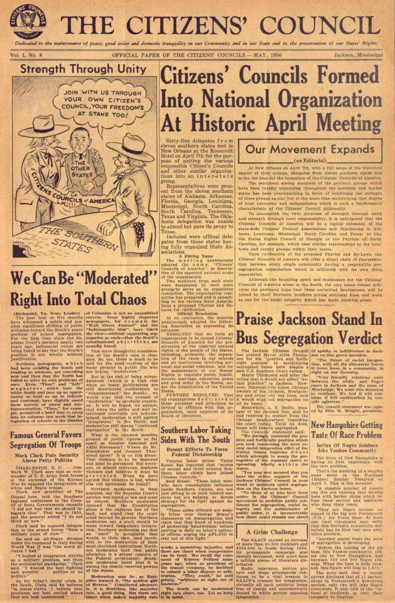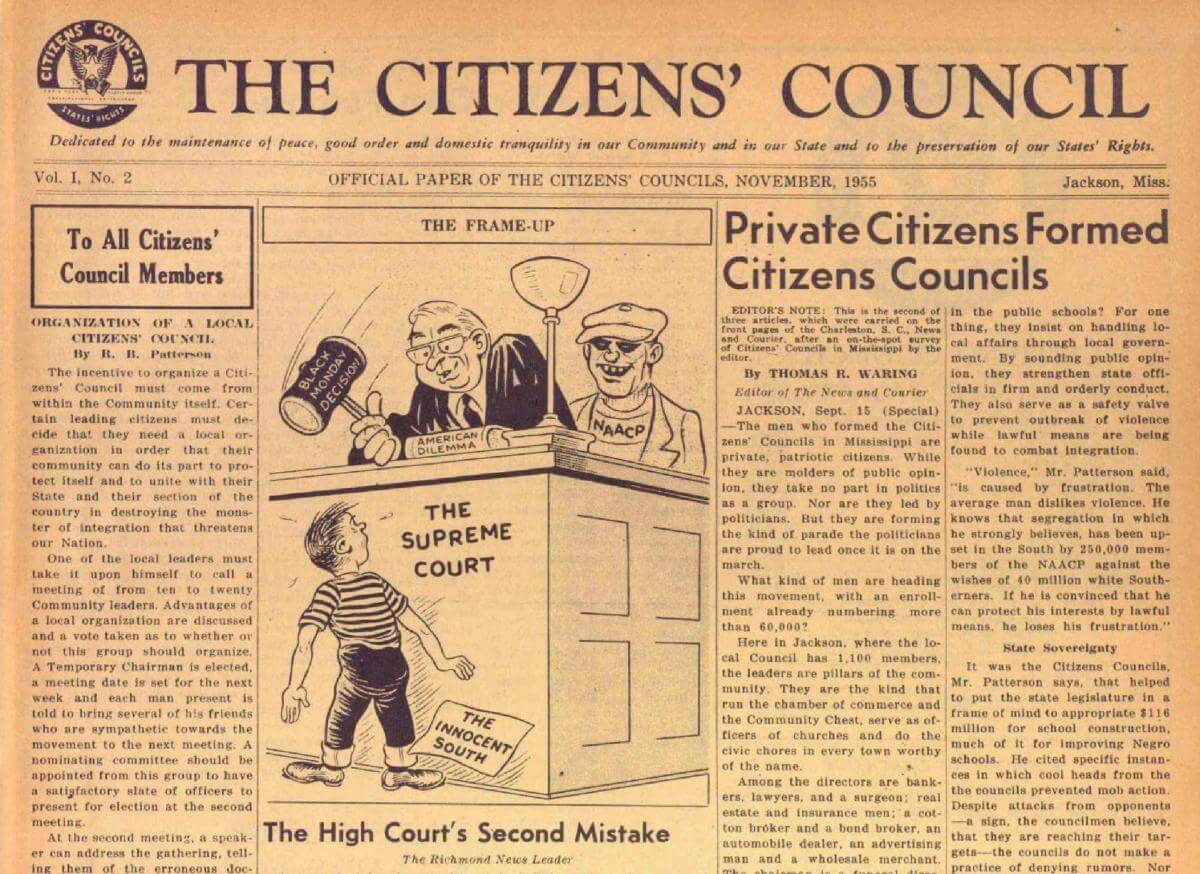 Front page of The Citizens' Council, Jackson, Mississippi, November 1955. Courtesy of Archive.org. Newspaper is in public domain. View full newspaper.